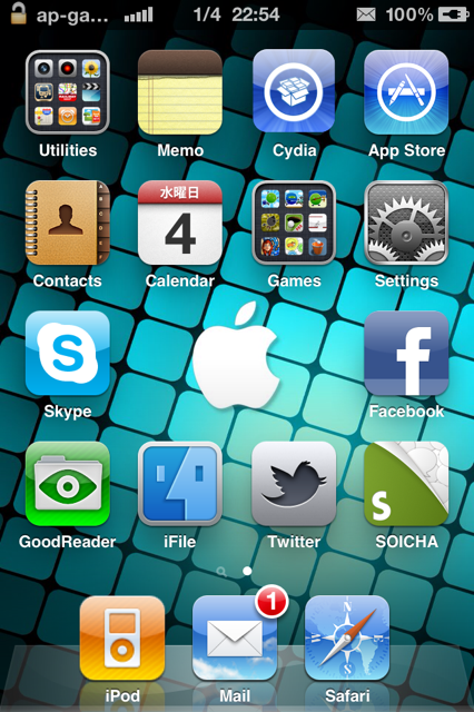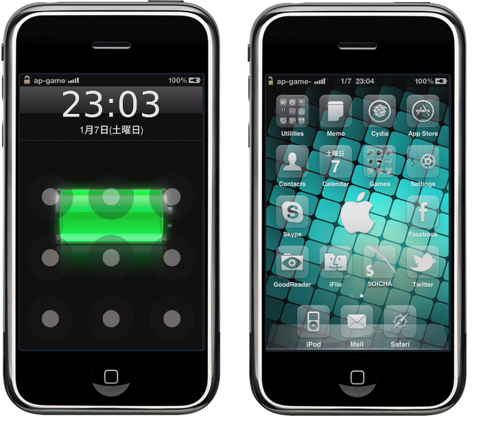 上の画面では、WinterBoardのテーマとして「Glasklart HD Icons」及び「Glaskleart HD Folders」を使用し、